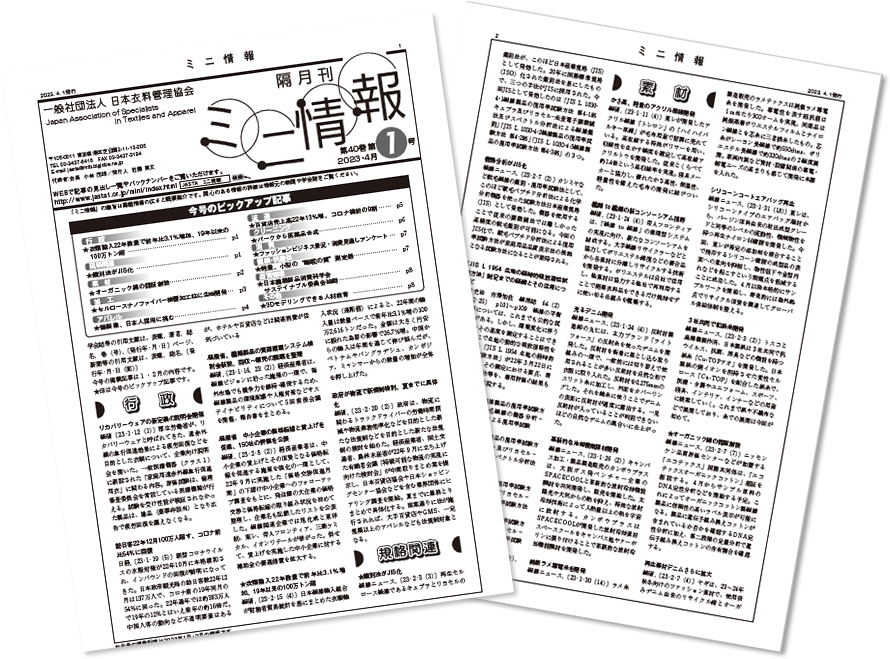 業界団体、業界関係者、大学など幅広い協会のネットワークを生かして、素材、加工、アパレル、流通、クリーニング、消費、クレーム、品質管理、規格関係といった繊維業界の各分野で起こっている最新情報をはじめ、経済産業省などの「行政」情報、関係団体で行われる「行事」情報を『ミニ情報』にまとめ、TA、TES有資格者などの当協会会員やファッション業界へ情報提供しています。
